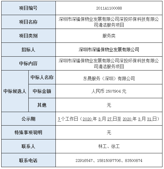 经深圳市国际招标有限公司组织招标的深圳市必一运动物业发展有限公司深投环保科技有限公司清洁服务项目已完成评审,现将本项目评审的相关情况及结果进行公示,具体内容如下: