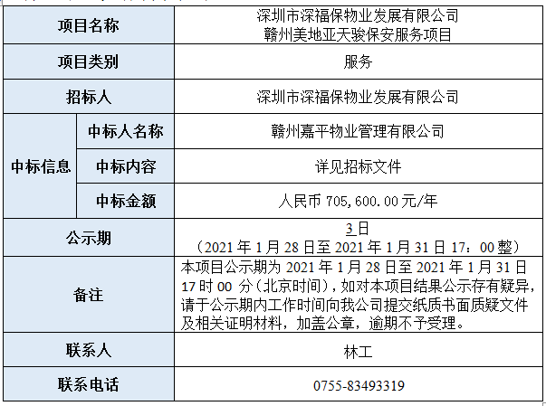 深圳市必一运动物业发展有限公司赣州美地亚天骏保安服务项目已完成评审,现将本项目评审的相关情况及结果进行公示,具体内容如下: