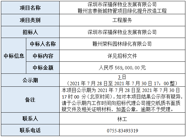 深圳市必一运动物业发展有限公司赣州吉泰新城物管项目绿化提升改造工程已完成评审,现将本项目评审的相关情况及结果进行公示,具体内容如下: