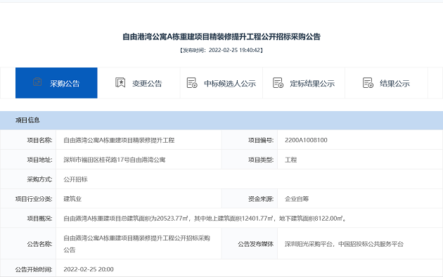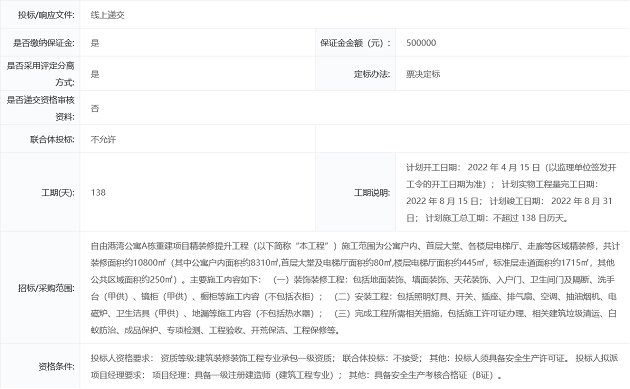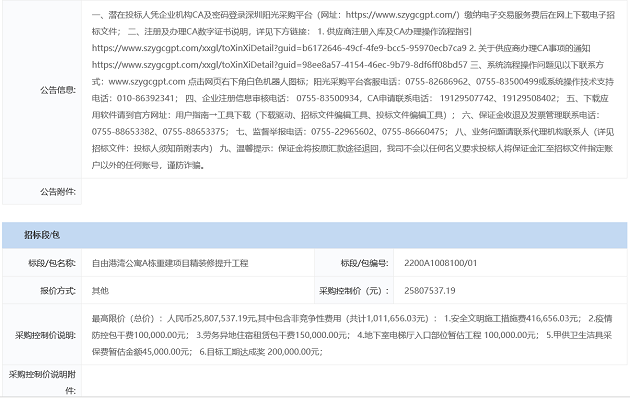 深圳市必一运动(集团)有限公司和中建二局第三建筑工程有限公司联合对自由港湾公寓A栋重建项目精装修提升工程进行公开招标,招标平台为深圳阳光采购平台(网址:https://www.szygcgpt.com/),有关事项如下: