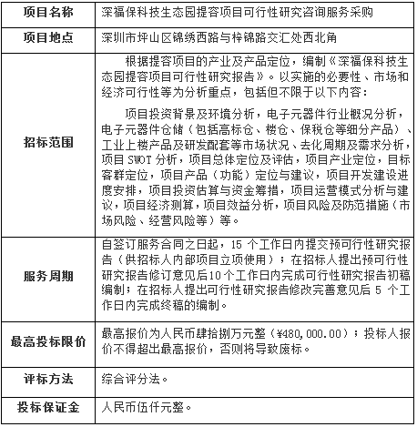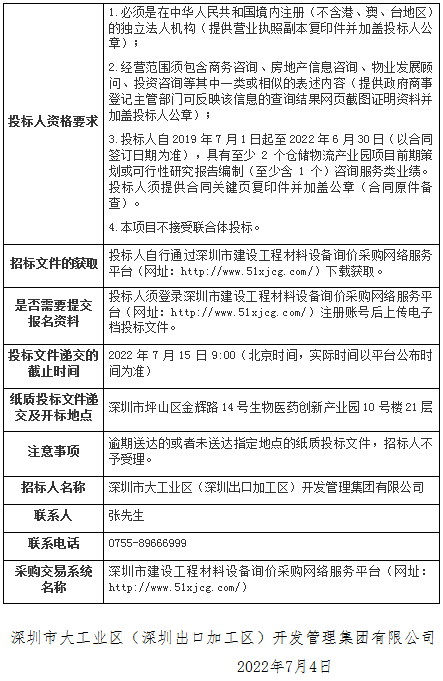 必一运动科技生态园提容项目可行性研究咨询服务采购(项目名称)的采购方为深圳市大工业区(深圳出口加工区)开发管理集团有限公司,采购资金来自企业自筹。目前项目已具备采购条件,现进行公开招标,欢迎符合资质并有意向的供应商投标报价,有关主要事项如下: