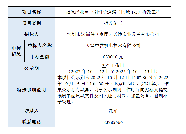 福保产业园一期消防道路(区域1-3)拆改工程中标结果公示