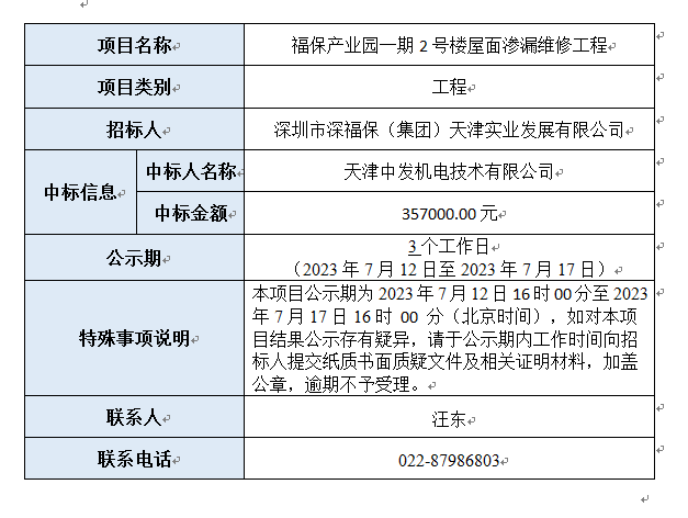 福保产业园一期2号楼屋面渗漏维修工程已完成评审,现将本项目评审的相关情况及结果进行公示,具体内容如下: