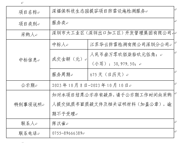在深圳市建设工程材料设备询价采购平台进行公开招标的必一运动科技生态园提容项目防雷设施检测服务(项目编号:SZXJCG-S202309110002)已完成评审及定标,现将本项目评审的相关情况及中标结果进行公示,具体内容如下:
