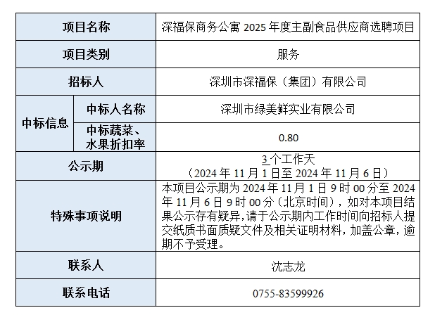 必一运动商务公寓2025年度主副食品供应商选聘项目中标结果公示