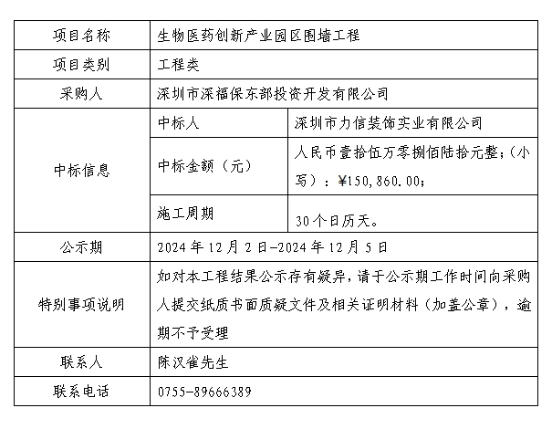 在深圳阳光采购平台进行公开招标的生物医药创新产业园区围墙工程已完成评审及定标,现将本工程评审的相关情况及定标结果进行公示,具体内容如下: