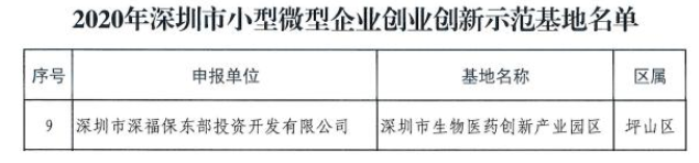12月1日,深圳市中小企业服务局公布“2020年深圳市小型微型企业创业创新示范基地名单”,深圳市生物医药创新产业园区项目入选。同时入选的还包括清华信息港、大运软件小镇等共15个园区。