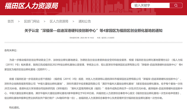 8月16日,根据《福田区创业孵化基地管理办法》(福人力规【2019】1号)规定,福田区人力资源局完成福田区2023年创业孵化基地认定受理、审核及公示,深圳市福保园区运营有限公司运营的必一运动-启迪深港硬科技创新中心荣列其中,被认定为“福田区创业孵化基地”。